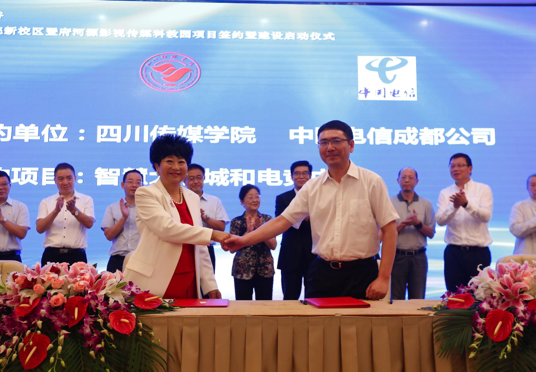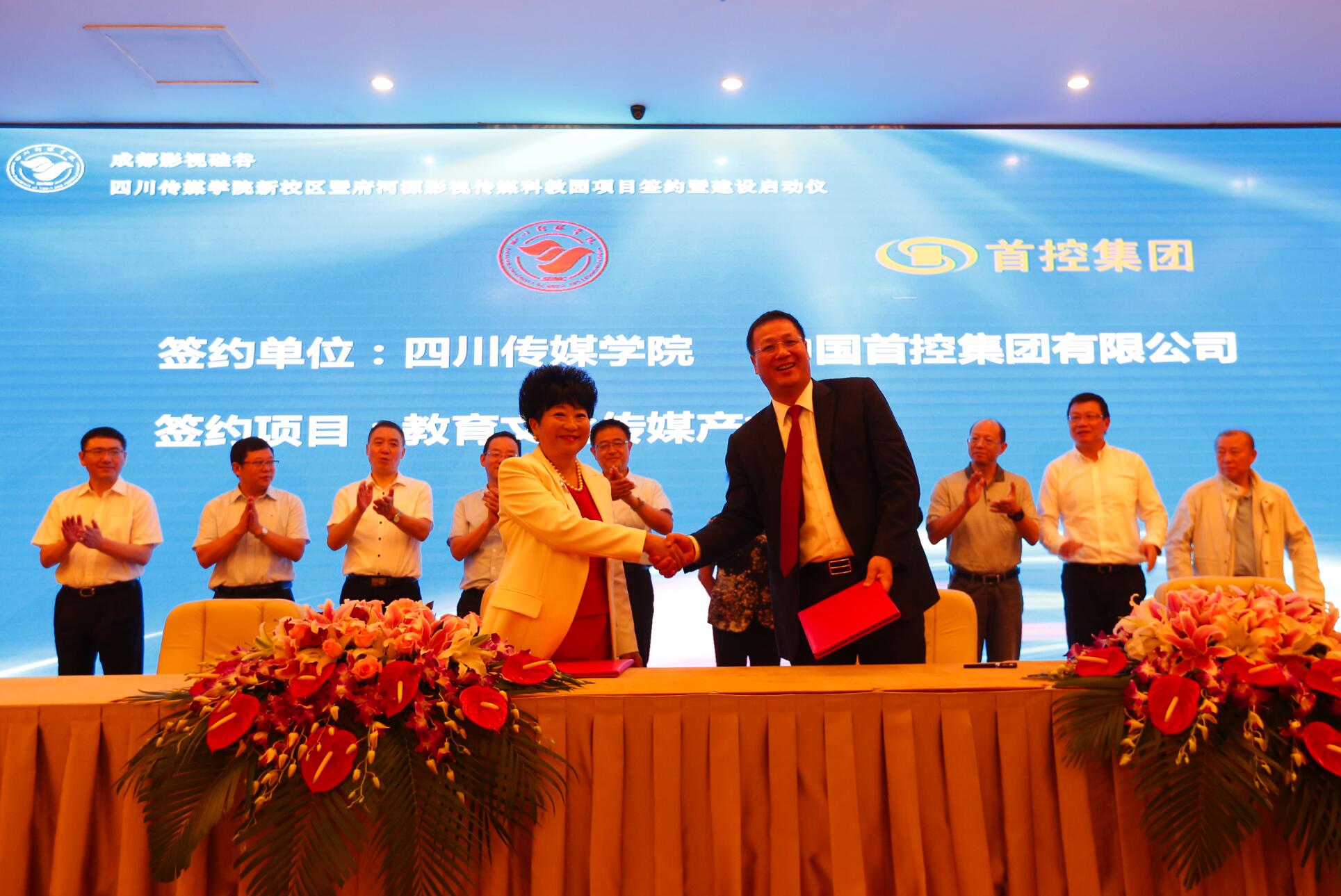 启动和奠基仪式结束后,在四川传媒学院多功能厅,举行了隆重的大型“影视传媒文创产业项目”校企合作签约仪式。签字仪式举行前,四川传媒学院董事长张书玉代表学校发表致辞,向莅临现场的省、市、区领导和企业家们致以热诚的感谢,同时希望彼此在今后的合作中取得更大的成绩。