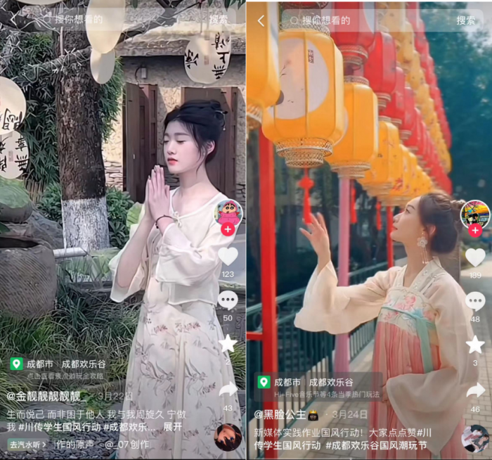 近期,“川传学生国风行动”话题在抖音亮相,学生们共产出视频内容157条,总播放量达64.6w。虽然这是一次新媒体课程实践任务,大一的学生在新媒体实践能力上还稍显稚嫩,但丝毫不影响大家创作的热情和作品质量,因为课堂实践也能参与到真实的企业大型活动中,是一次难得的机会,也是对他们专业能力的直接肯定。2023年,有声语言艺术学院与成都欢乐谷共建实践基地,双方借助各自优势开展实践、实习等合作。作为成都市文化产业重点项目和旅游产业重点项目,成都欢乐谷因其设施、服务完备的主题公园深受游客喜爱的同时,也在主题活动策划上进行着大胆的尝试。此次,我院学生参与的“国潮”推介活动,就属于2024年成都欢乐谷国潮文化节的一部分。此次国潮文化节携手中国文字博物馆,以中华文字为魂,创新打造了一场集沉浸巨制场景、国潮乐舞盛典、沉浸多元互动、主题实景演艺于一体的全新潮玩国风盛宴,为游客呈现一场别具一格的潮玩国风盛宴。因为有合作的前提,学生作品一经上线,就得到了成都欢乐谷的重视和肯定,在作品中评出“国风行动最具影响力作品”、“国风行动最具创意作品”、“国风行动优秀指导教师”等三个奖项。我院学生冯治斌、李佳帅受邀担任国潮新生代代表“国风男大”,身着传统服饰、新中式服饰在成都欢乐谷园区与游客互动,传扬中华传统文化。2024年,“新中式”可谓“一马当先”火热出圈,新中式穿搭、宋锦外套、马面裙等频频登上各社交平台热搜,“新中式”俨然成了流量密码。《2023中国品牌发展趋势报告》显示,2019年至2022年,购买国货国潮相关产品的中国消费者数量增长74%,成交金额增长355%。中国纺织工业联合会数据显示,2023年“新中式”服饰市场规模达10亿元级别,近三年来,相关产品商品交易总额增速超过100%。日益增强的文化自信、越发符合当下流行审美的时尚设计,让国人在中国品牌、国货“潮品”中找到了归属感和自豪感。国潮文化节通过各种活动,如华服大秀、情景大剧等,充分挖掘和展现国风文化,为大学生提供了一个近距离接触和了解国潮文化的机会,同时也鼓励他们以创新的视角去理解和体验这些文化元素。对于学校而言,通过实践活动鼓励大学生通过自身行动,争当推介人,让越来越多的人开始关注并喜欢传统文化,从中感受到中国传统文化的力量。对于企业来说,深入挖掘中国传统文化内涵,用好的创意和设计打造优质的产品,探索更多传统文化的全新表达,讲好中国故事。期待续写更多精彩!