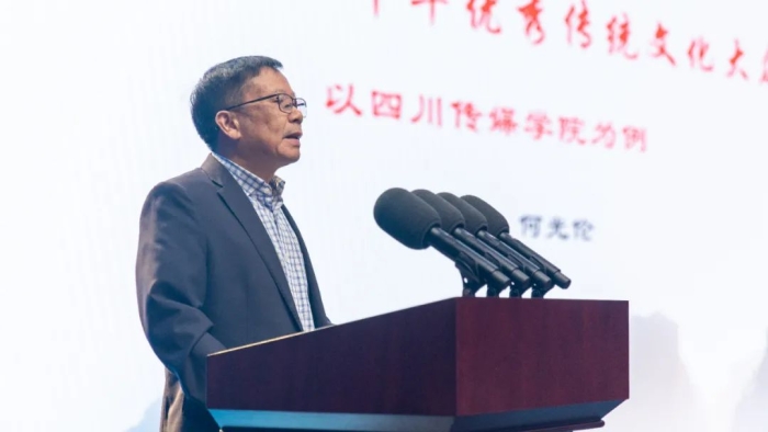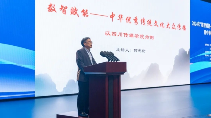 随后,四川省政府文史研究馆馆员、四川传媒学院名誉校长、四川省图书馆学会理事长何光伦作了题为《数智赋能——中华优秀传统文化大众传播——以四川传媒学院为例》的主旨发言。