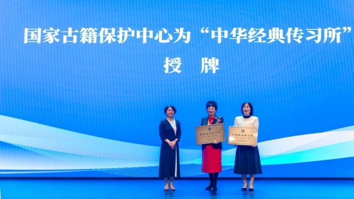在授牌环节,国家古籍保护中心为四川传媒学院“中华经典传习所”正式授牌,由四川省图书馆副馆长杜桂英和四川传媒学院理事长张书玉上台接受授牌,国家图书馆党委书记陈樱亲自颁发。此举标志着四川传媒学院在传统文化传承与创新方面迈上了新的台阶。
