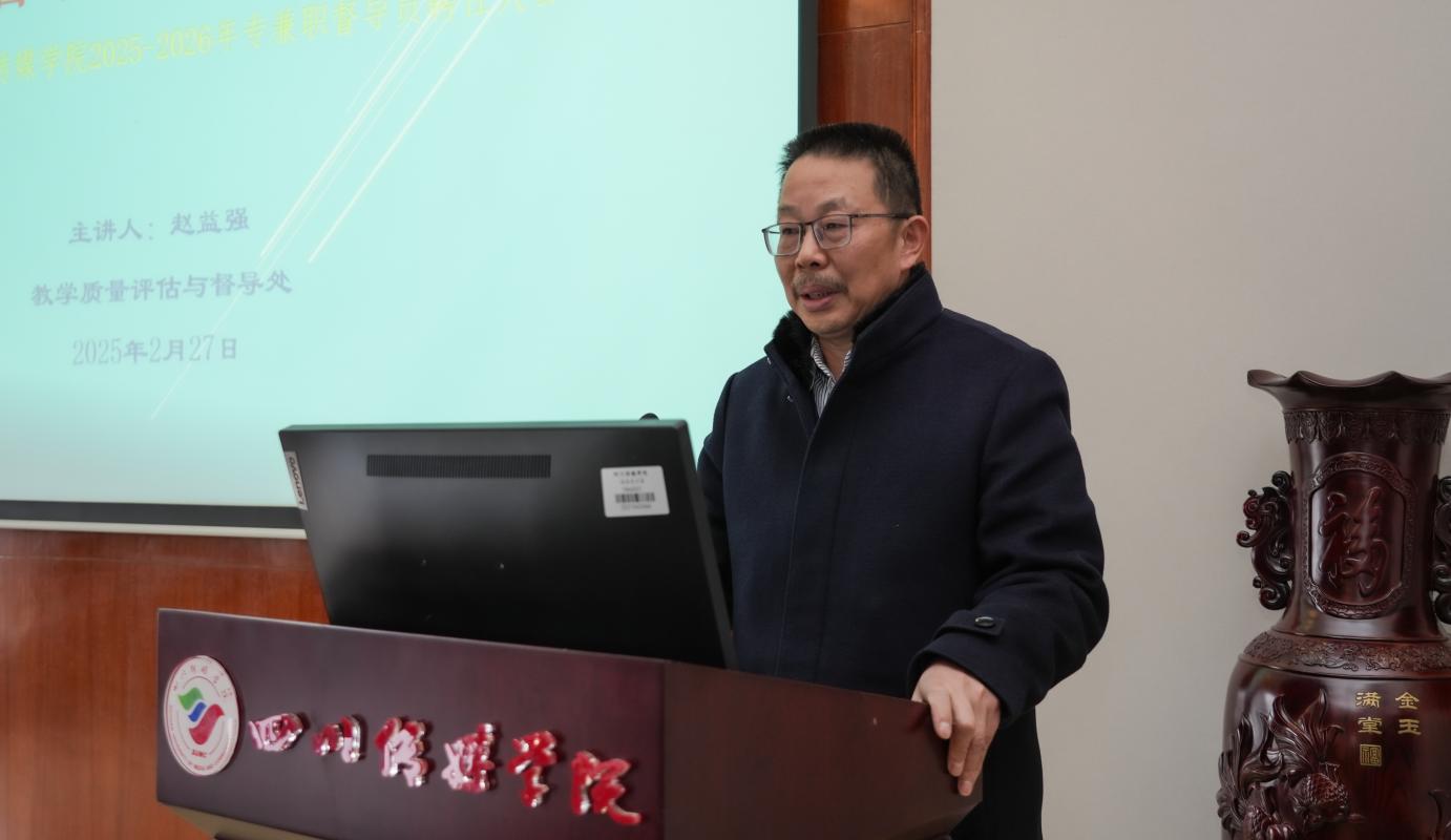 大会第三项,评督处赵益强老师作了《学校教学督导工作总结与安排》。他分别对《四川传媒学院关于进一步加强本科教学质量保障体系建设的意见》(川媒院〔2024〕50号)和《四川传媒学院教学督导工作条例(修订)》(川媒院〔2025〕3号)两个文件精神及主要内容作了解读,并对过去学校教学督导工作做了简单回顾,介绍了学校2025年教学督导工作计划安排,提出了今后教学督导工作的建议。
