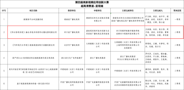 该获奖作品融合多项前沿视听技术,目前已实现成果转化,并在四川省重点文化产业项目——“巴中影视硅谷(恩阳)科普大视界”中进行8k环幕展映,这将推动超高淸视听前沿技术在普场景中的实际应用。