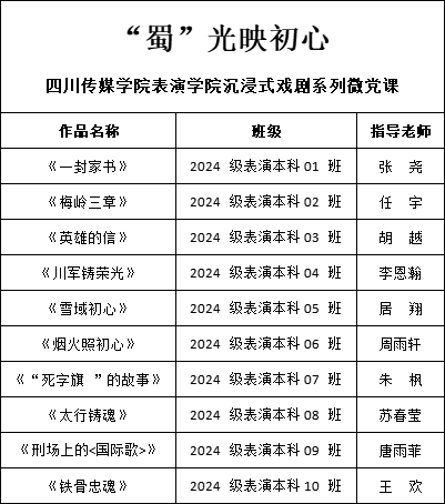 近日,由四川省委党史研究室、省委网信办、文化和旅游厅、退役军人事务厅、省档案馆、团省委、省文物局联合主办的“红色记忆·党史光影”2025年四川省优秀党史短视频征集展播活动评选结果正式公布。四川传媒学院申报的《“蜀”光映初心——四川传媒学院表演学院沉浸式戏剧系列微党课》在全省955部参赛作品中脱颖而出,荣获“特别奖”,四川传媒学院荣获“组织奖”。
