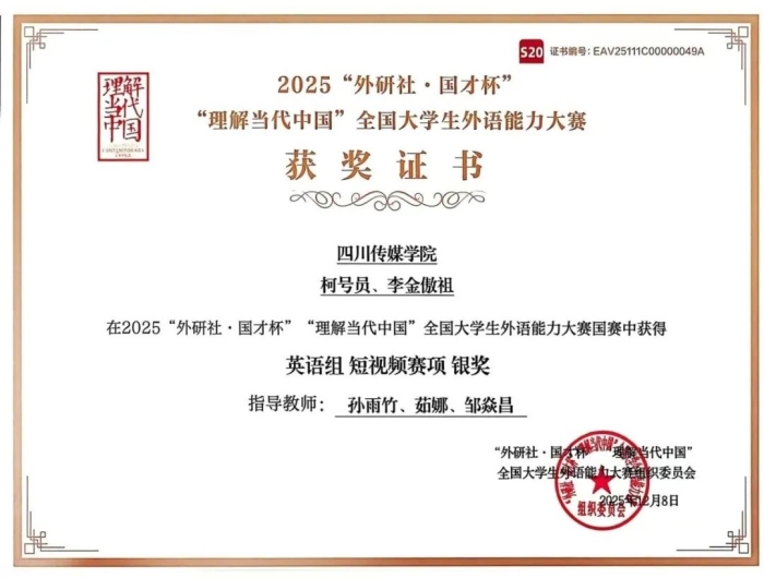 近日,2025年“外研社·国才杯”“理解当代中国”全国大学生外语能力大赛英语组短视频赛项结果揭晓。四川传媒学院有声语言艺术学院学生柯号员、李金傲祖的作品《依然·神奇》从全国1100余所院校的17778部作品中脱颖而出,勇夺国家级银奖。