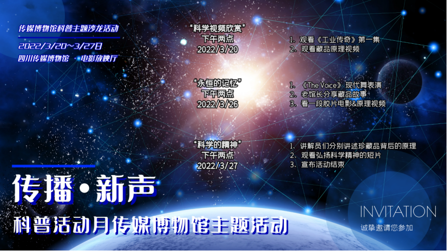 为全面贯彻十九大和十九届历次全会精神,贯彻省委十一届三次全会以来历次全会精神和省委、省政府重大决策部署,传播科学思想,普及科学知识,弘扬科学精神,提升博物馆服务活力和水平,四川传媒学院传媒博物馆结合行业特色,于2022年3月20日至27日成功举办了三期主题为“传播·新声”传媒博物馆科普月主题活动。在科普月主题活动中,学生们通过了解藏品原理故事感受传媒科技发展的力量,用艺术展现力呈现藏品的活力与生命力。博物馆用电影、音乐、舞蹈、演讲等多种形式丰富活动内容,利用互联网等多种方式对科普活动月进行了全方位、多角度的宣传,营造了良好的科技文化素质教育氛围。活动具体开展情况如下: