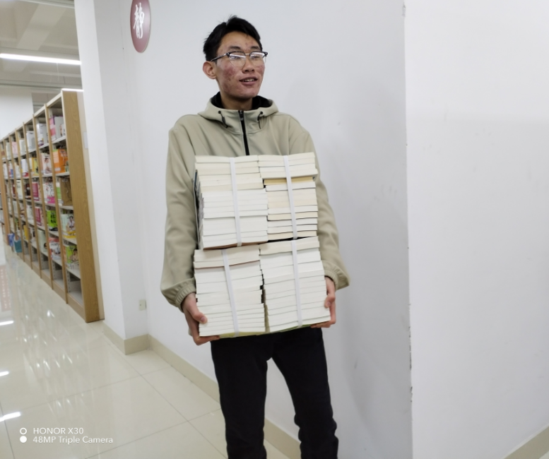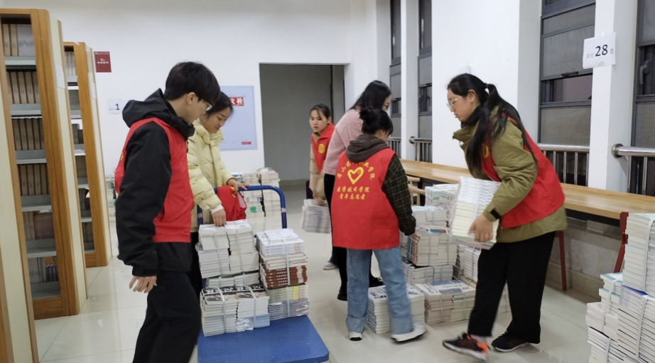 图书馆有5万册验收后未上架的图书,如小山般占据了图书馆北侧三层楼的阅览区,影响了同学们的阅读,急需快速搬运至指定地点上架。如此大量的任务,让图书馆不得不向学院求援,12月4日医技学院张书记、医技学院青年志愿者协会立即响应,接下此项艰巨任务。虽然他们大多是身材瘦小的女生,但干劲满满,工具不够,有车的装车拉车,没车就一包又一包的手提怀抱,每包书有几十斤重呀,就这样一趟又一趟的搬运。拉车的也不轻松,重车要翻过两个门槛,需要几个人合力才推得过去,一会功夫就干得满头大汗。图书馆老师一边叮嘱学生注意安全,一边也跟着同学生们一起热火朝天的干,他们的行动感动了在场的其他学生,几个男生(询问下了解到是口腔1班的学生)主动加入了队伍,并很快的成了主力军,在众人的努力下,书山快速缩小直至全部搬完。
