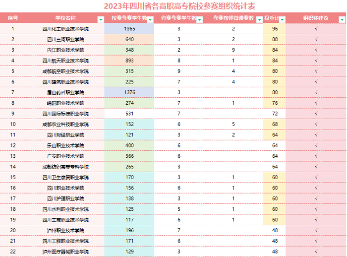 本次大赛于 2023 年 9 月 27 日正式启动,历时 50 余天,省内 36 所高职高专院校 8671 名学生和 45 名教师参加了比赛。按照赛制规则,本次大赛分为学生个人赛和教师微课赛两个赛道。共决出学生个人特等奖9 名,一等奖 19 名,二等奖 49 名,三等奖 73 名。教师微课赛一等奖 8 名、二等奖14 名、三等奖 23名。大赛还评选出优秀指导教师和最佳组织奖。赛事主办方希望各参赛院校以信息素养大赛为抓手,以赛促建、以赛促教、以赛促学,推动四川省高职高专院校信息素养教育再上新台阶。